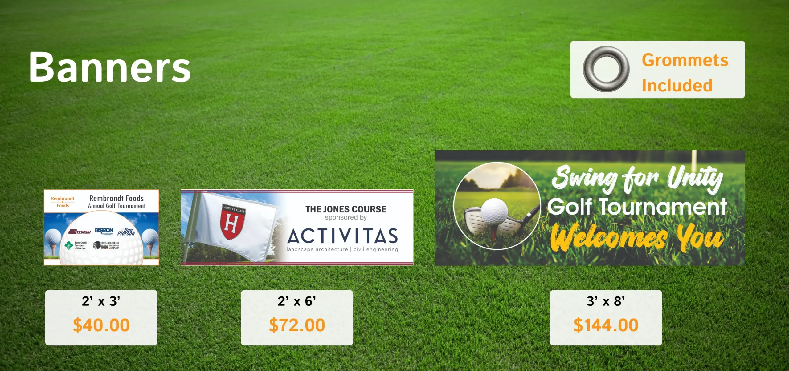 No hidden charges. Custom Design, Overnight Shipping, Stakes, Grommets, all included on every order over $99.