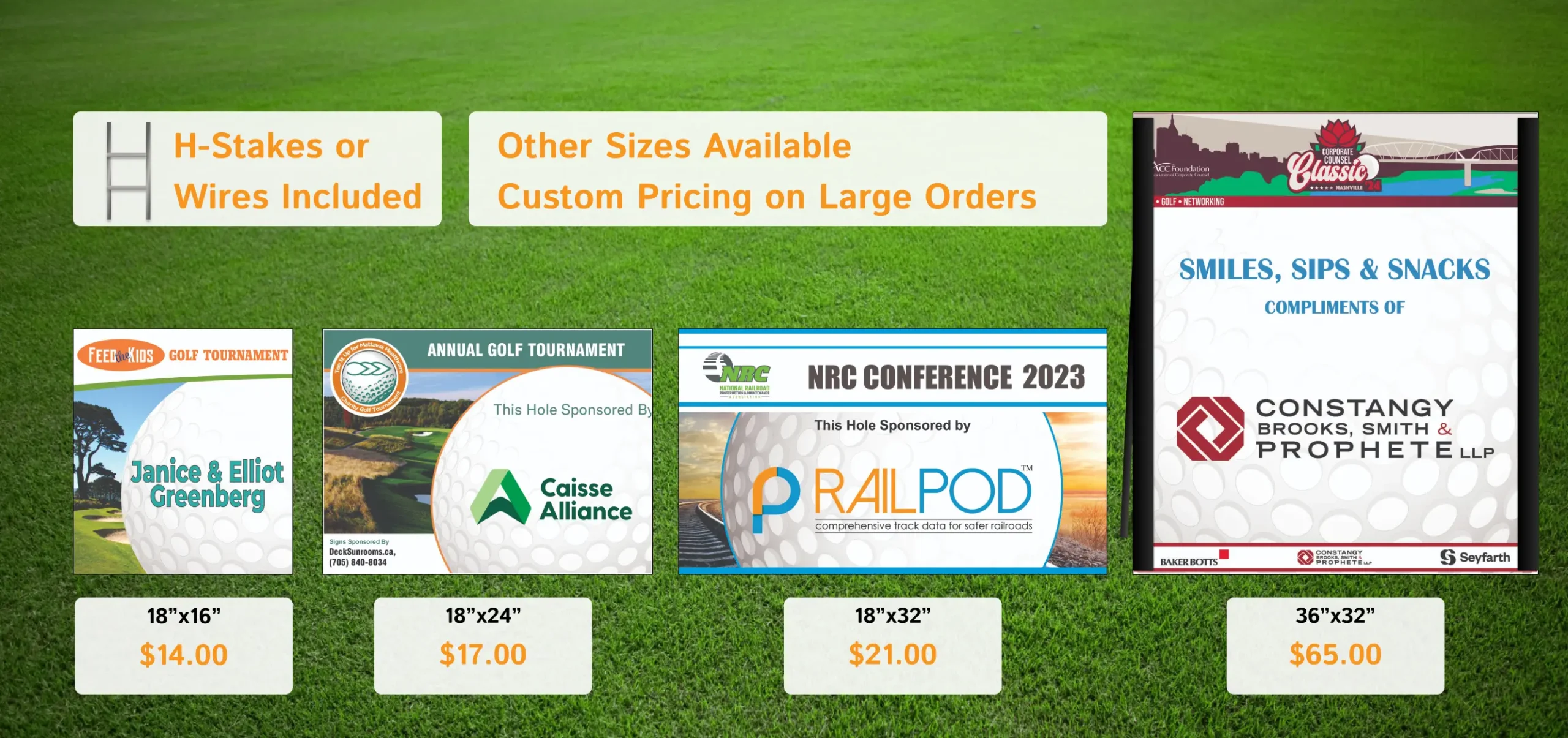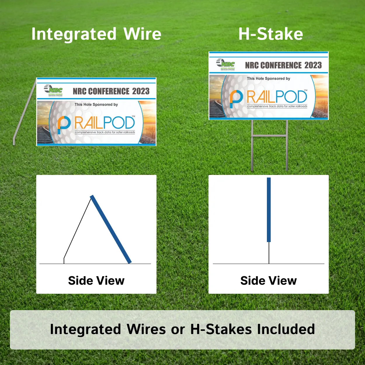 Our Tee and Hole Signs feature eye-catching Custom Designs, are made from durable and weatherproof Coroplast (so they stand up, even if the weather doesn’t), and come with H-Stakes or Integrated Wires, so you’ll have everything you need on tournament day.